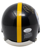 Pittsburgh Steelers mini helmet has been hand-signed and inscribed in gold paint pen by Rocky Bleier. The lot / autograph(s) includes an official James Spence Authentication (JSA) hologram and matching COA for authenticity purposes. Authentication: JSA COA