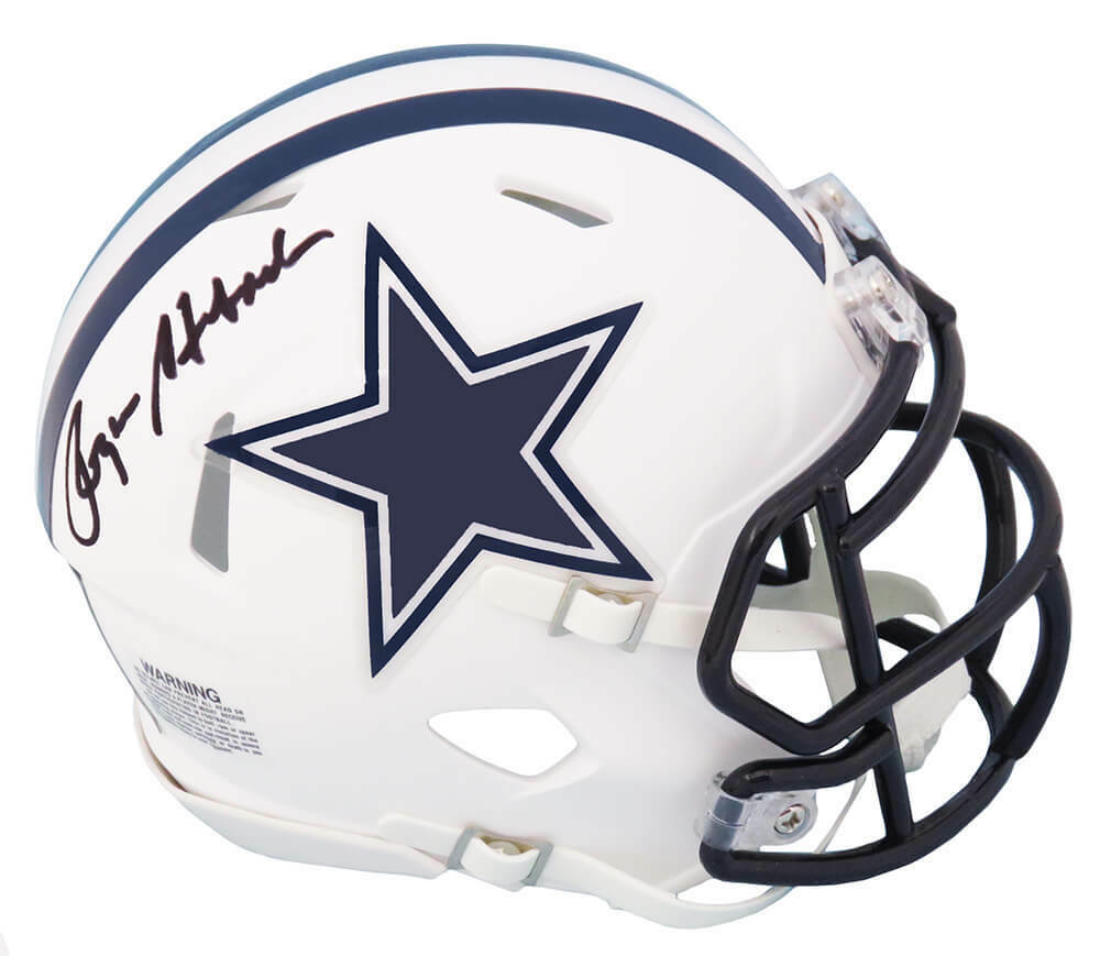 Roger Staubach signed Dallas Cowboys flat white matte Riddell speed mini helmet. Item comes with a Schwartz Sports Memorabilia tamper-proof numbered hologram and Certificate of Authenticity which can be verified online.