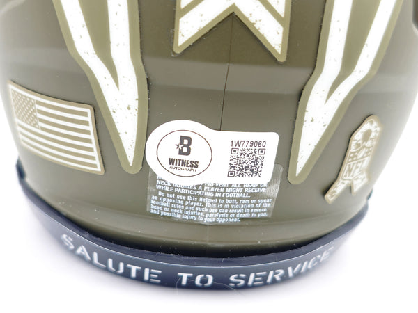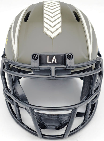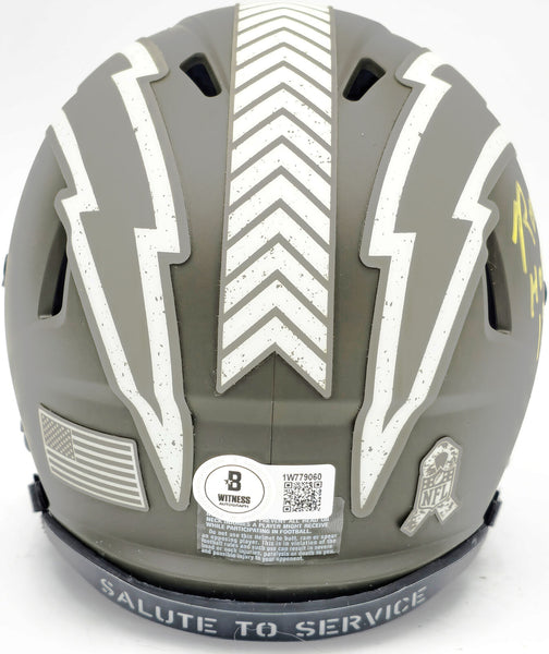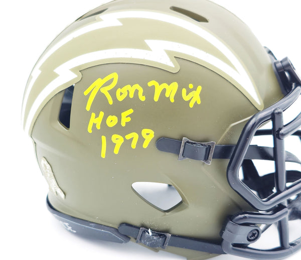 This is a San Diego Chargers Army Green Salute to Service Speed Mini Helmet that has been hand signed by Ron Mix. This item was inscribed "HOF 1979." This item has been witnessed and certified authentic by Beckett Authentication (BAS) and comes with their tamper-proof witness sticker.