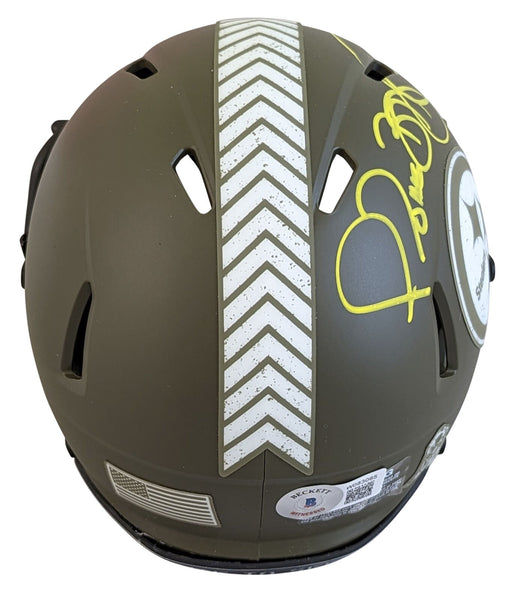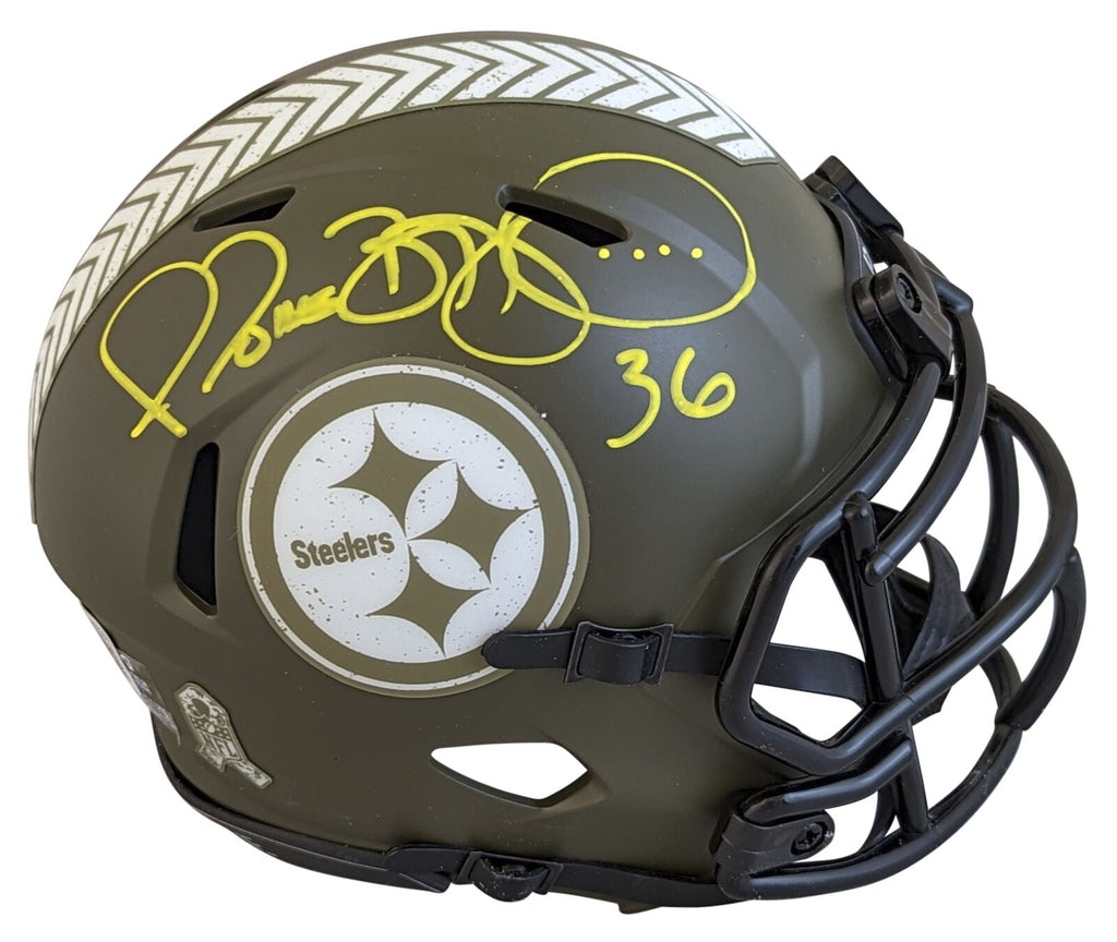 This Autographed Alternate Salute To Service Speed Mini Helmet has been Personally Signed by Jerome Bettis of the Pittsburgh Steelers. This item is 100% Authentic to include a hologram by Beckett Authentication Services. This item will come with the new Beckett Authentication hologram that has a scannable QR code rather than the traditional COA. If you would like to have a COA, you are welcome to reach out to Beckett for a printed certification once you receive your item. This is a BAS Witnessed Protection Program item which means a Beckett Authentication Service representative was present when this item was being signed. We conducted an autograph signing with Jerome Bettis where multiples of the same item were signed. While the photographs are representative of this item, the size, placement and strength of the signature may vary. Each item is hand signed, therefore, each autograph is unique. This item can be verified through BAS Witnessed.
