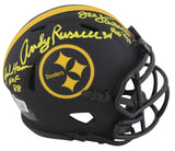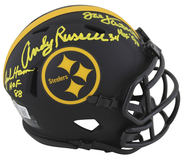 This Autographed Alternate Eclipse Speed Mini Helmet with the inscription of "2x SB Champs (Russell), HOF 88 (Ham), HOF 90 (Lambert)" has been Personally Signed by Jack Lambert, Jack Ham & Andy Russell of the Pittsburgh Steelers. This item is 100% Authentic to include a hologram by Beckett Authentication Services. This item will come with the new Beckett Authentication hologram that has a scannable QR code rather than the traditional COA. If you would like to have a COA, you are welcome to reach out to Beckett for a printed certification once you receive your item. This is a BAS Witnessed Protection Program item which means a Beckett Authentication Service representative was present when this item was being signed. We conducted an autograph signing with Jack Lambert, Jack Ham & Andy Russell where multiples of the same item were signed. While the photographs are representative of this item, the size, placement and strength of the signature may vary. Each item is hand signed, therefore, each autograph is unique. This item can be verified through BAS Witnessed.