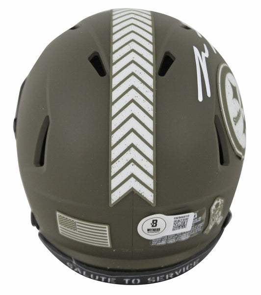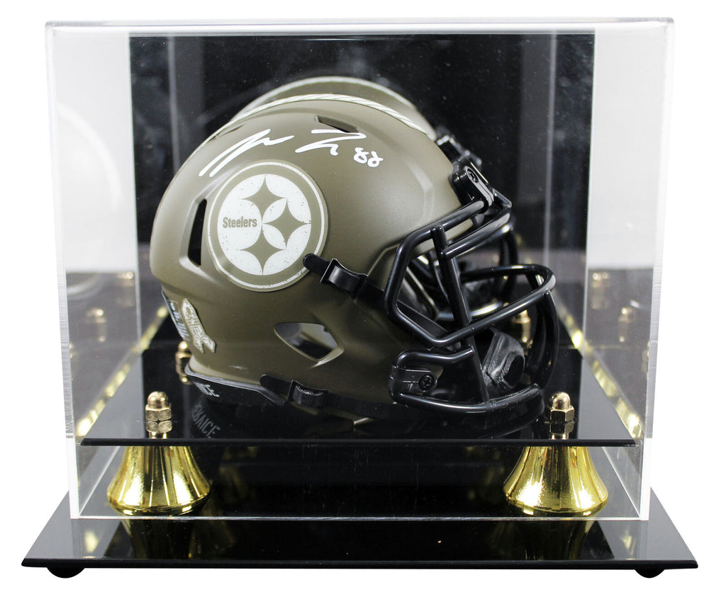 This Autographed Alternate Salute To Service Speed Mini Helmet W/ Uv Mirrored Back Acrylic Display Case has been Personally Signed by Pat Freiermuth of the Pittsburgh Steelers. This item is 100% Authentic to include a hologram by Beckett Authentication Services. This item will come with an affixed Beckett Authentication Services (BAS) authentication sticker, which includes a scannable QR code to verify authenticity. Please note that Beckett no longer provides serial-numbered COA cards, and the attached BAS sticker will serve as the complete authentication for this item. This is a BAS Witnessed Protection Program item which means a Beckett Authentication Service representative was present when this item was being signed. We conducted an autograph signing with Pat Freiermuth where multiples of the same item were signed. While the photographs are representative of this item, the size, placement and strength of the signature may vary. Each item is hand signed, therefore, each autograph is unique. This item can be verified through BAS Witnessed.