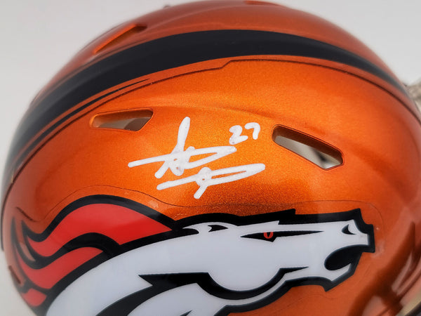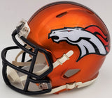 This is a Denver Broncos Flash Orange Speed Mini Helmet that has been hand signed by Steve Atwater. The Flash helmets are very delicate and often have some marks or scratches on them. This item has been certified authentic by Beckett Authentication (BAS) and comes with their tamper-proof QR Code sticker that can be verified on the Beckett-authentication.com.