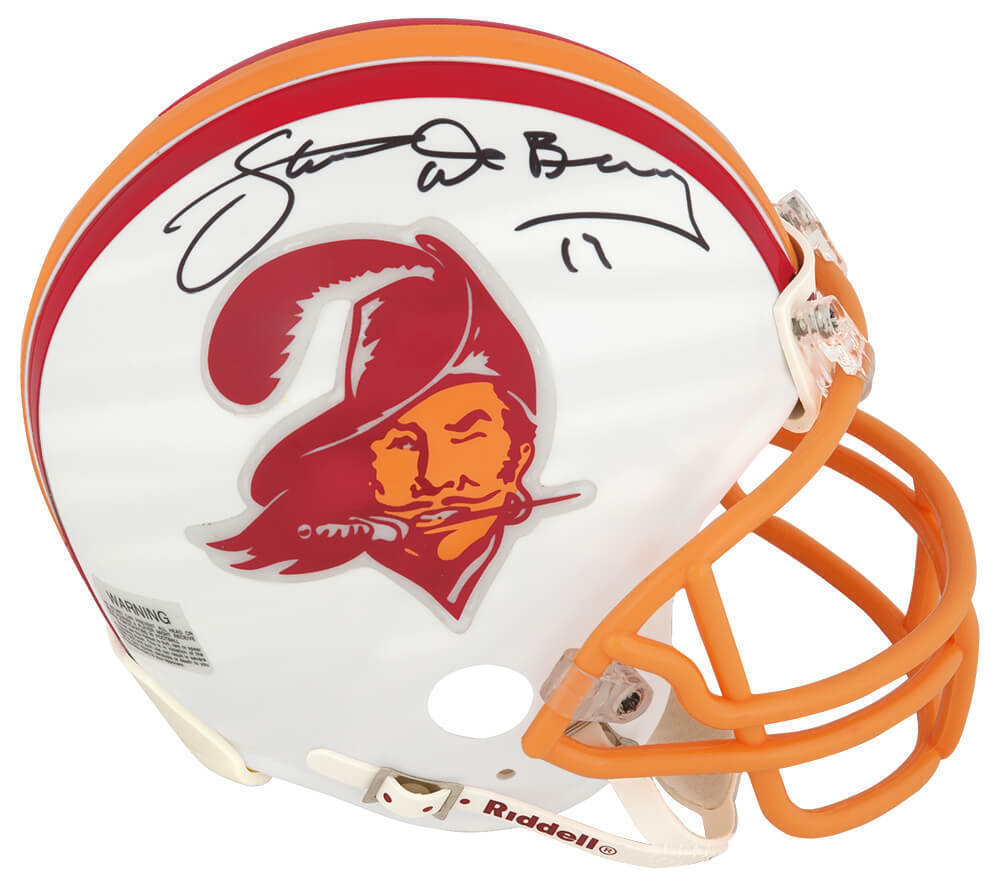 Steve DeBerg signed Tampa Bay Buccaneers throwback white (vsr4) Riddell mini helmet. Item comes with a Schwartz Sports Memorabilia tamper-proof numbered hologram and Certificate of Authenticity which can be verified online.