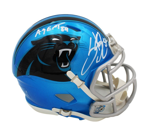 A Carolina Panthers Speed Flash NFL Mini Helmet hand signed by Steve Smith Sr. The item and signature are in excellent condition. In addition to signing his name, Steve also inscribed "Agent 89" on the item. Steve is one of the feistiest players in NFL history. His attitude and determination have made him a fan favorite in Baltimore and Carolina. Now bring home a piece of his exclusive memorabilia line that celebrates the career of a true NFL icon. AUTHENTICATION: The item has been tagged with a SmarTag powered by Prova Technology, which gives you digital access to the items authentication records, including a proof picture from the signing.