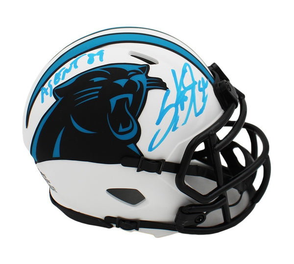 A Carolina Panthers Speed Lunar NFL Mini Helmet hand signed by Steve Smith Sr. The item and signature are in excellent condition. In addition to signing his name, Steve also inscribed "Agent 89" on the item. Steve is one of the feistiest players in NFL history. His attitude and determination have made him a fan favorite in Baltimore and Carolina. Now bring home a piece of his exclusive memorabilia line that celebrates the career of a true NFL icon. AUTHENTICATION: The item has been tagged with a SmarTag powered by Prova Technology, which gives you digital access to the items authentication records, including a proof picture from the signing.