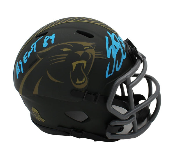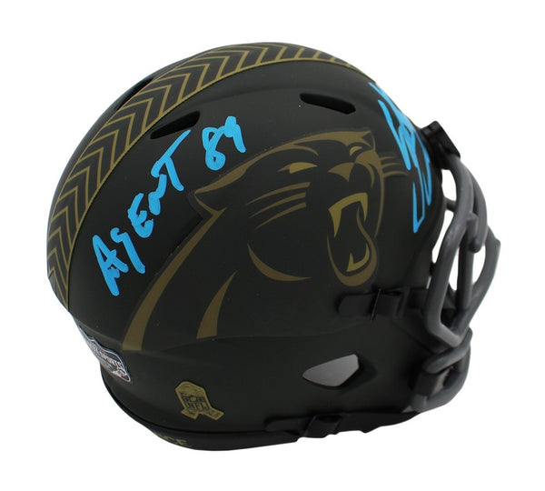 A Carolina Panthers Speed Salute to Service 4 NFL Mini Helmet hand signed by Steve Smith Sr. The item and signature are in excellent condition. In addition to signing his name, Steve also inscribed "Agent 89" on the item. Steve is one of the feistiest players in NFL history. His attitude and determination have made him a fan favorite in Baltimore and Carolina. Now bring home a piece of his exclusive memorabilia line that celebrates the career of a true NFL icon. AUTHENTICATION: The item has been tagged with a SmarTag powered by Prova Technology, which gives you digital access to the items authentication records, including a proof picture from the signing.