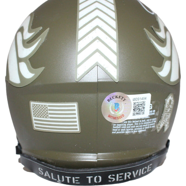 Terrell Davis Signed Denver Broncos Salute HOF Mini Helmet Beckett 42219 The number in the listing title is just an inventory sku for our records and is not the authentication number. The item pictured is a stock photo unless otherwise noted. This is a Denver Broncos Salute to Service Mini Helmet that was personally autographed by Terrell Davis with "HOF" inscription. Includes a certificate of authenticity from Beckett Authentication Services (BAS) and Denver Autographs.