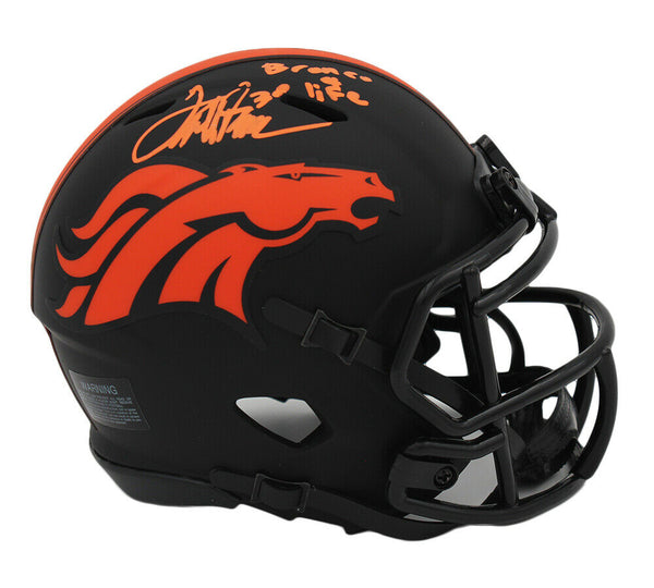 A Denver Broncos Speed Eclipse NFL Mini Helmet hand signed by Terrell Davis. The item and signature are in excellent condition. In addition to signing his name, Terrell inscribed "Broncos 4 Life" on the item. Terrell is a former NFL running back. He was drafted 6th round in the 1995 NFL Draft by the Denver Broncos. 2x Super Bowl Champion, Super Bowl (XXXII) MVP, 3x Pro Bowler, 3x First-Team All-Pro, 1998 NFL MVP. AUTHENTICATION: The item is accompanied by a Certificate of Authenticity - Serial Numbered and Databased Hologram - Picture of Terrell from the Signing