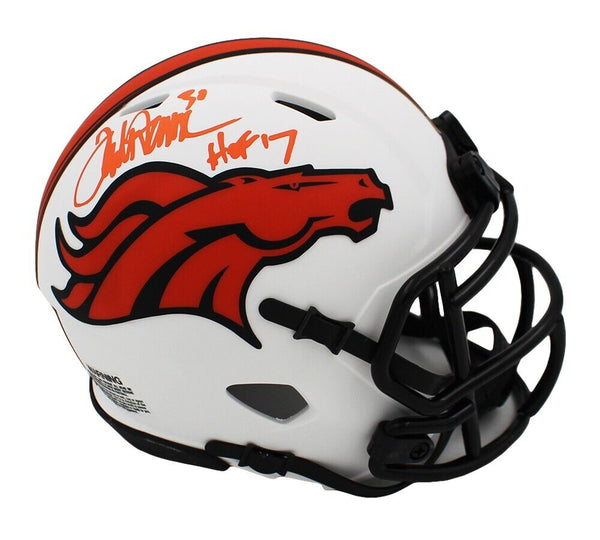 A Denver Broncos Speed Lunar NFL Mini Helmet hand signed by Terrell Davis. The item and signature are in excellent condition. In addition to signing his name, Terrell inscribed "HOF 17" on the item. Terrell is a former NFL running back. He was drafted 6th round in the 1995 NFL Draft by the Denver Broncos. 2x Super Bowl Champion, Super Bowl (XXXII) MVP, 3x Pro Bowler, 3x First-Team All-Pro, 1998 NFL MVP. AUTHENTICATION: The item is accompanied by a Certificate of Authenticity - Terrell Davis Exclusive Serial Numbered and Databased Hologram - Picture of Terrell from the Signing