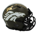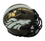 A Denver Broncos Speed Salute to Service NFL Mini Helmet hand signed by Terrell Davis. The item and signature are in excellent condition. In addition to signing his name, Terrell inscribed "SB XXXII MVP" on the item. Terrell is a former NFL running back. He was drafted 6th round in the 1995 NFL Draft by the Denver Broncos. 2x Super Bowl Champion, Super Bowl (XXXII) MVP, 3x Pro Bowler, 3x First-Team All-Pro, 1998 NFL MVP. AUTHENTICATION: The item is accompanied by a Certificate of Authenticity - Terrell Davis Exclusive Serial Numbered and Databased Hologram - Picture of Terrell from the Signing