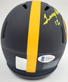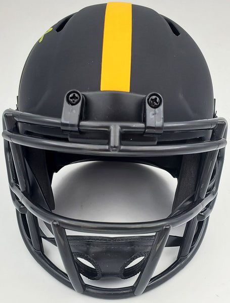 This is an Eclipse Black Pittsburgh Steelers Speed Mini Helmet that has been hand signed by Terry Bradshaw. This item has been certified authentic by Beckett Authentication (BAS) and comes with their sticker and matching certificate of authenticity. A A A NOTE: The Eclipse Black helmets are very delicate and often have some marks or scratches on them.