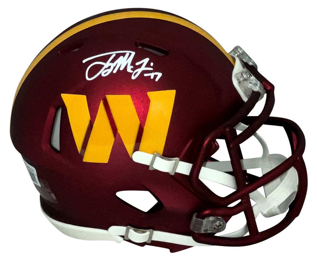 Terry McLaurin, star wide receiver for the Washington Commanders, has hand signed this Commanders Riddell Speed mini helmet at a private signing. This item is authenticated by Beckett Authentication Services and was signed in the presence of one of their representatives. Their tamper-evident hologram featuring a QR code and serial number is on the item. The authenticity can be verified online by entering the serial number or scanning the QR code.Item pictured may not be the exact item you will receive. It will be similar quality, and we guarantee your satisfaction.