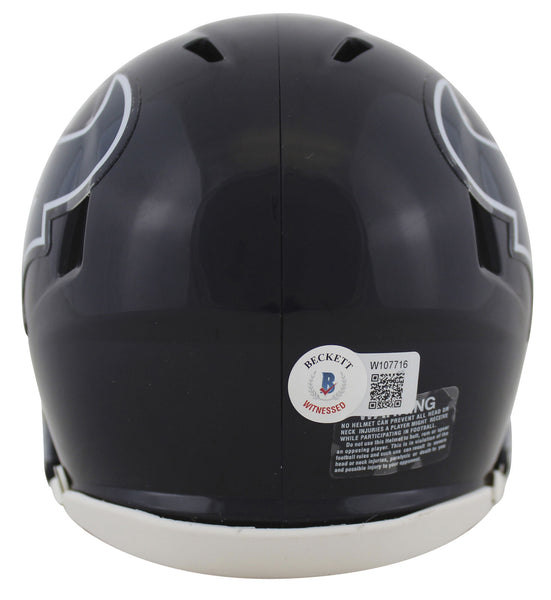 This Autographed Speed Mini Helmet has been Personally Signed by Andre Johnson of the Houston Texans. This item is 100% Authentic to include a hologram by Beckett Authentication Services. This item may come with the new Beckett Authentication hologram that has a scannable QR code rather than the traditional COA. If you would like to have a COA, you are welcome to reach out to Beckett for a printed certification once you receive your item. This is a BAS Witnessed Protection Program item which means a Beckett Authentication Service representative was present when this item was being signed. We conducted an autograph signing with Andre Johnson where multiples of the same item were signed. While the photographs are representative of this item, the size, placement and strength of the signature may vary. Each item is hand signed, therefore, each autograph is unique. This item can be verified through BAS Witnessed.