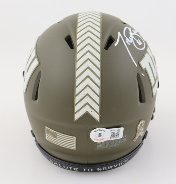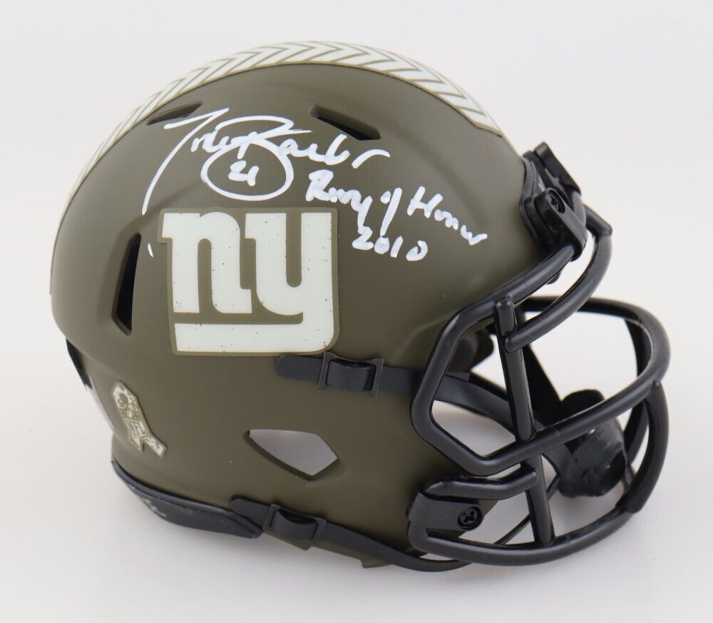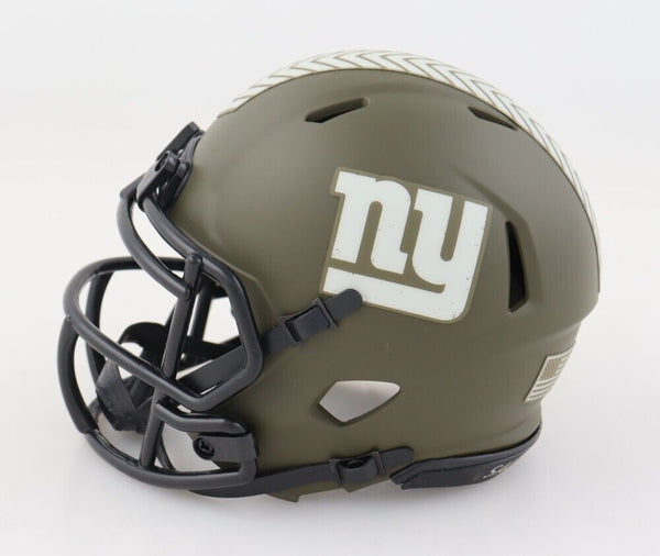 Riddell New York Giants Salute to Service Alternate speed mini helmet. Hand-signed by Tiki Barber.The lot / autograph(s) includes an official Beckett Authentication Services serially numbered hologram for authenticity purposes. The signing of this item was witnessed by Beckett.Authentication: Beckett Hologram