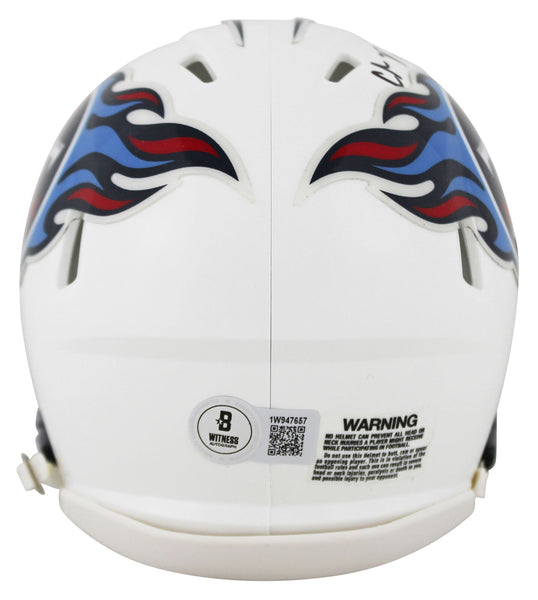 This Autographed 1999-2017 Throwback White Speed Mini Helmet has been Personally Signed by Chris Johnson of the Tennessee Titans. This item is 100% Authentic to include a hologram by Beckett Authentication Services. This item will come with an affixed Beckett Authentication Services (BAS) authentication sticker, which includes a scannable QR code to verify authenticity. Please note that Beckett no longer provides serial-numbered COA cards, and the attached BAS sticker will serve as the complete authentication for this item. This is a BAS Witnessed Protection Program item which means a Beckett Authentication Service representative was present when this item was being signed. The authenticity can be verified on Beckett Authentication Services website.
