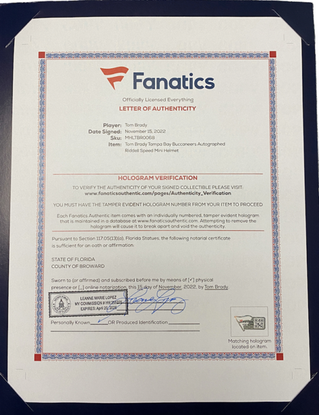 This Tampa Bay Buccaneers mini speed helmet has been personally hand-signed by Tom Brady. It is officially licensed by the National Football League and comes with an individually numbered, tamper-evident hologram from Fanatics Authentic. To ensure authenticity, the hologram can be reviewed online. This process helps to ensure that the product purchased is authentic and eliminates any possibility of duplication or fraud.