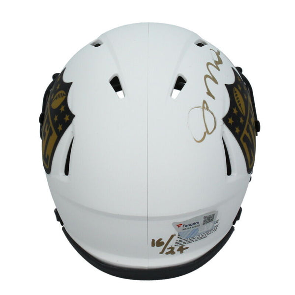 This NFL Shield Lunar Eclipse mini speed helmet has been personally hand-signed by Tom Brady and Joe Montana. It is officially licensed by the National Football League and comes with an individually numbered, tamper-evident hologram from Fanatics Authentic. To ensure authenticity, the hologram can be reviewed online. This process helps to ensure that the product purchased is authentic and eliminates any possibility of duplication or fraud.This helmet is limited to just 24 and you are bidding on number "16" from the edition.