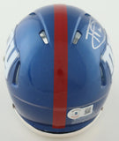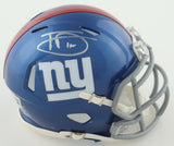 Riddell New York Giants Speed mini helmet. Hand-signed by New York Giants Head Coach Tommy DeVito. In week 10 of the 2023 season DeVito was named the Giants starting Quarterback, as the season progressed, DeVito quickly became a fan favorite, as he went from an undrafted third string rookie quarterback to leading an underachieving Giants team to some surprising success (3straight wins, at one point). He was given the nickname "Tommy Cutlets" in reference to being of Italian heritage and mentioning that he likes to eat his mother's chicken cutletsThe autograph includes an official Beckett Authentication Services serially numbered hologram for authenticity purposes. The signing of this item was witnessed by Beckett.Authentication: Beckett Hologram