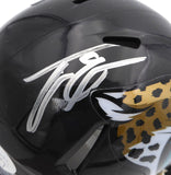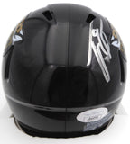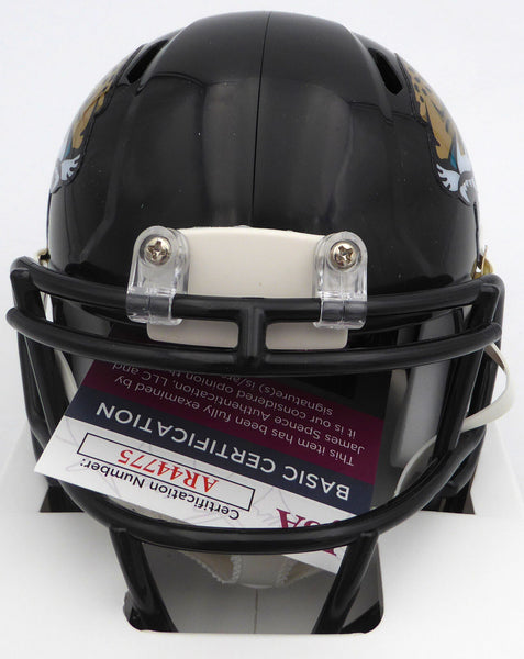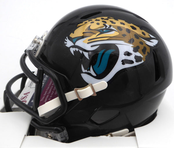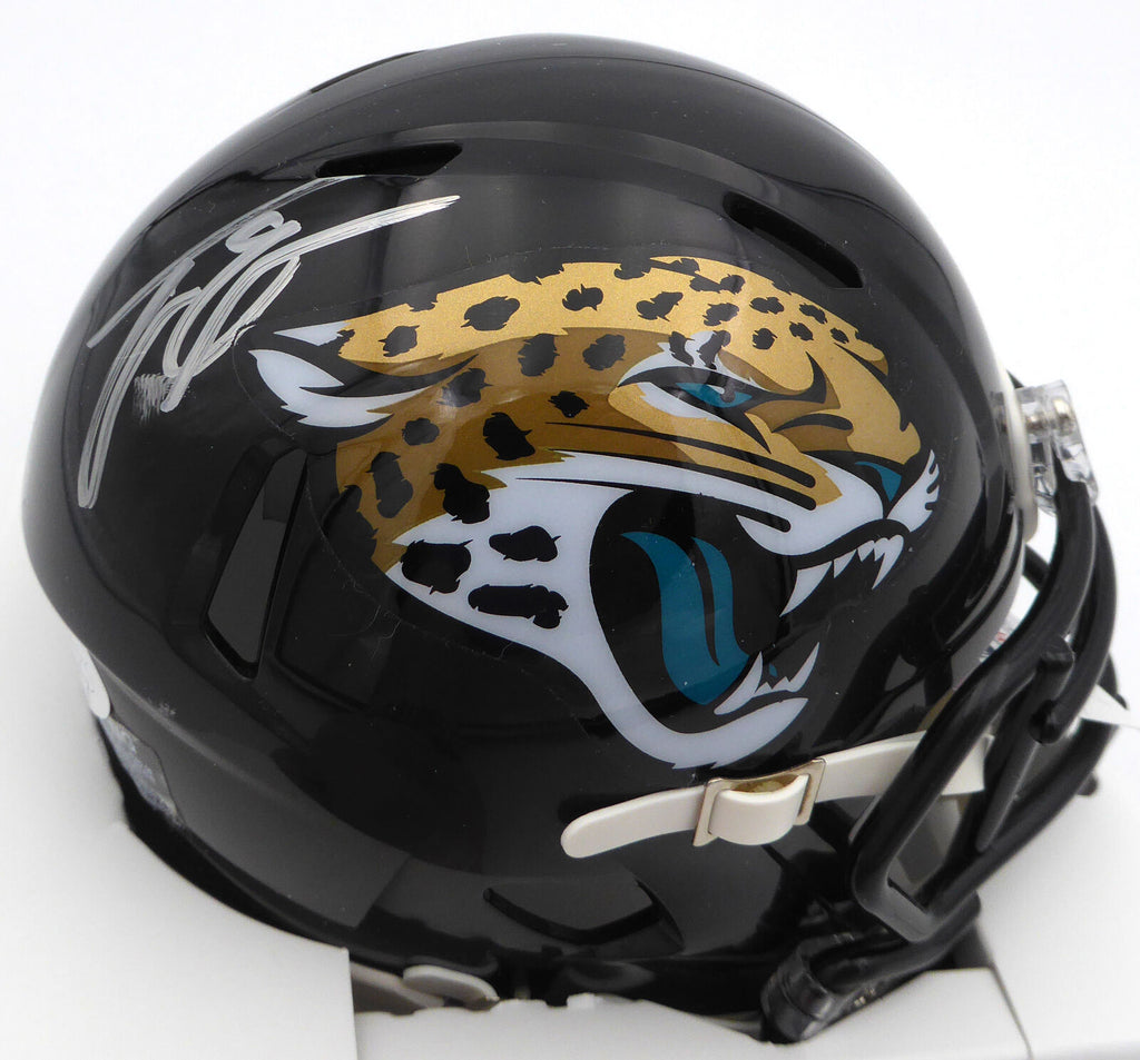 This is a Jacksonville Jaguars Black Speed Mini Helmet that has been hand signed by Travis Etienne. There is a smudge in the signature as shown. This item has been certified authentic by JSA and comes with their tamper-proof sticker and matching certificate of authenticity.