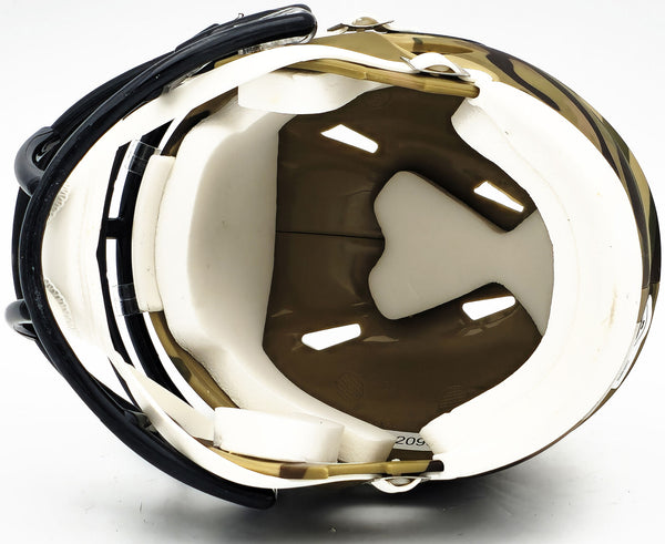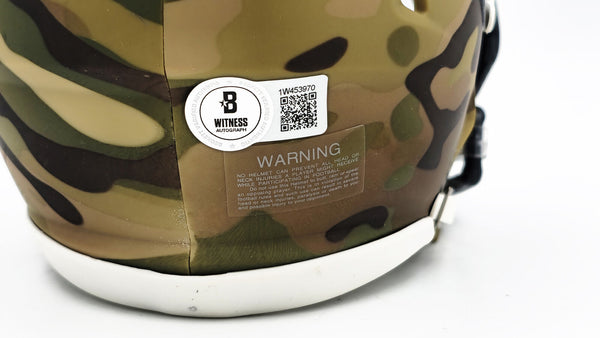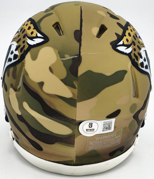 This is a Jacksonville Jaguars Camo Speed Mini Helmet that has been hand signed by Travis Etienne. Because each Camo helmet is hand-dipped using water-transfer technology there may be slight imperfections. This item has been witnessed and certified authentic by Beckett Authentication (BAS) and comes with their tamper-proof witness sticker.