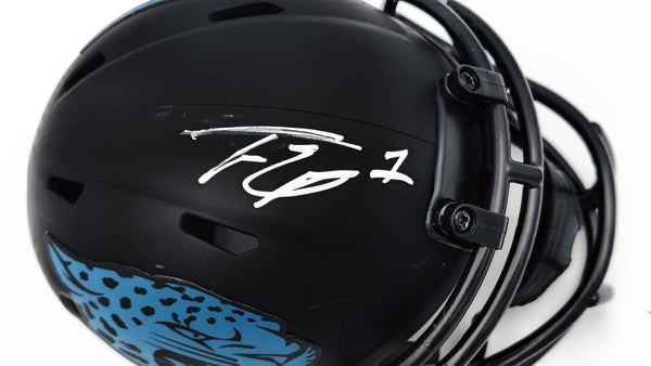 This is a Jacksonville Jaguars Eclipse Black Speed Mini Helmet that has been hand signed by Travis Etienne. The Eclipse helmets are delicate and may have some marks or scratches on them. This item has been witnessed and certified authentic by Beckett Authentication (BAS) and comes with their tamper-proof witness sticker.