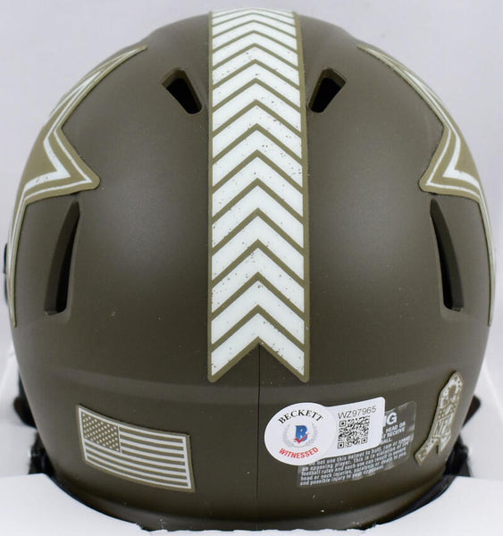 Trevon Diggs Autographed Dallas Cowboys Salute to Service Speed Mini Helmet- Beckett W Hologram *Blue This is a Trevon Diggs of the Dallas Cowboys hand autographed Riddell Speed Salute to Service Mini Helmet. This item has a Beckett Witness Authentication, which comes with a numbered hologram and QR code for verification. You can view this item on the Beckett website. It was signed either at a public autograph appearance or a private signing. This is a stock photo of the item. Although you may not receive this exact item, the item you receive is virtually identical, brand new, and in great shape.