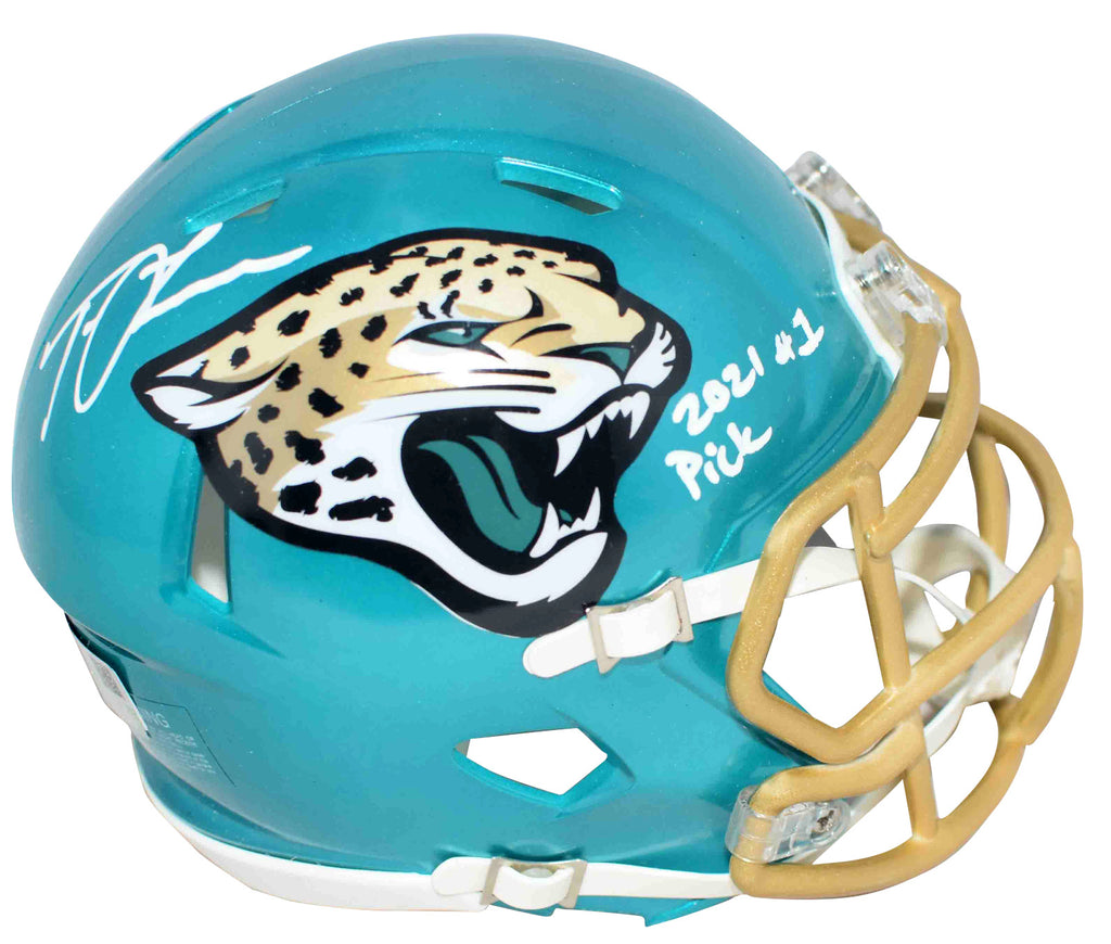 Trevor Lawrence, star quarterback for the Jacksonville Jaguars, has hand signed this Jaguars Riddell Speed Flash mini helmet at a private signing. He included the inscription "2021 #1 Pick" with his signature. This item comes with a serial-numbered hologram from Fanatics Authentic, one of the leaders in the industry. The authenticity can be verified online by entering the serial-number. A Fanatics Authentic information card is also included.Item pictured may not be the exact item you will receive. It will be similar quality, and we guarantee your satisfaction.