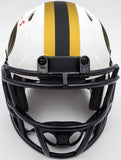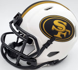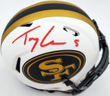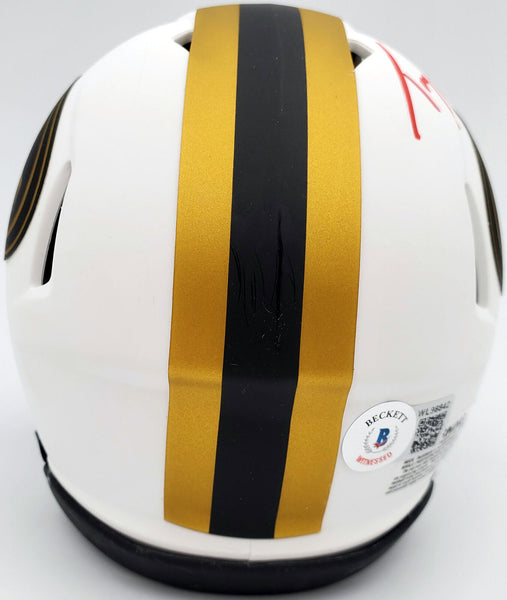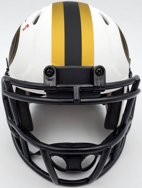 This is a San Francisco 49ers Lunar Eclipse White Speed Mini Helmet that has been hand signed by Trey Lance. The Eclipse helmets are very delicate and often have some marks or scratches on them. This item has been certified authentic by Beckett Authentication (BAS) and comes with their tamper-proof QR Code sticker that can be verified on the Beckett-authentication.com.