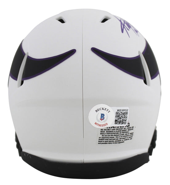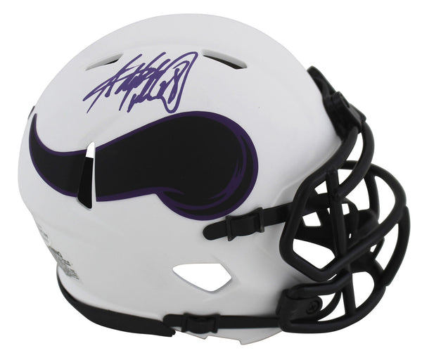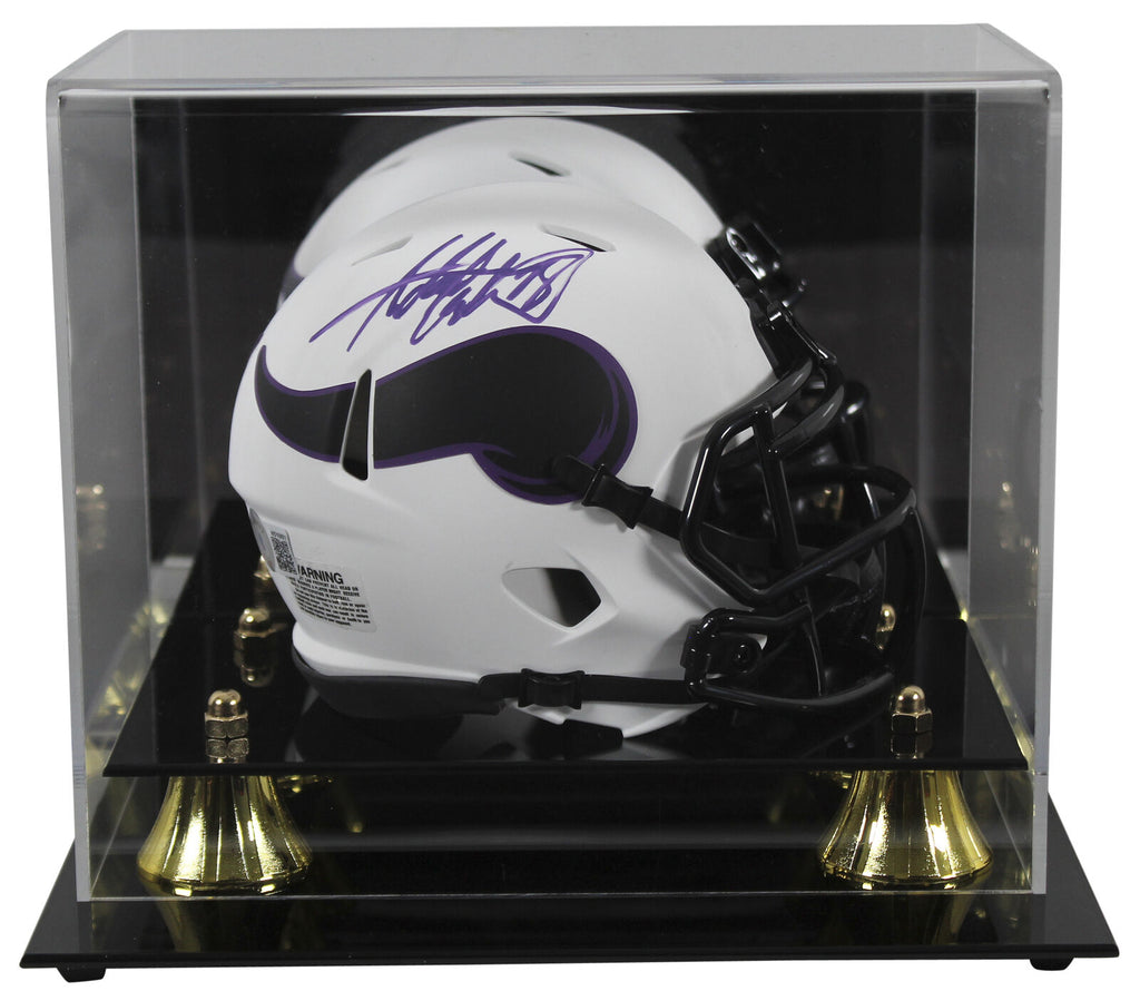 This Autographed Alternate Lunar Speed Mini Helmet W/ Uv Mirrored Back Acrylic Display Case has been Personally Signed by Adrian Peterson of the Minnesota Vikings. This item is 100% Authentic to include a hologram by Beckett Authentication Services. This item will come with the new Beckett Authentication hologram that has a scannable QR code rather than the traditional COA. If you would like to have a COA, you are welcome to reach out to Beckett for a printed certification once you receive your item.This is a BAS Witnessed Protection Program item which means a Beckett Authentication Service representative was present when this item was being signed. We conducted an autograph signing with Adrian Peterson where multiples of the same item were signed. While the photographs are representative of this item, the size, placement and strength of the signature may vary. Each item is hand signed, therefore, each autograph is unique. This item can be verified through BAS Witnessed.