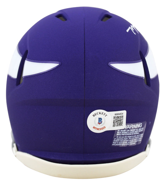 This Autographed 2023 On Field Alternate Purple Speed Mini Helmet has been Personally Signed by T.J. Hockenson of the Minnesota Vikings. This item is 100% Authentic to include a hologram by Beckett Authentication Services. This item will come with an affixed Beckett Authentication Services (BAS) authentication sticker, which includes a scannable QR code to verify authenticity. Please note that Beckett no longer provides serial-numbered COA cards, and the attached BAS sticker will serve as the complete authentication for this item. This is a BAS Witnessed Protection Program item which means a Beckett Authentication Service representative was present when this item was being signed. We conducted an autograph signing with T.J. Hockenson where multiples of the same item were signed. While the photographs are representative of this item, the size, placement and strength of the signature may vary. Each item is hand signed, therefore, each autograph is unique. This item can be verified through BAS Witnessed.
