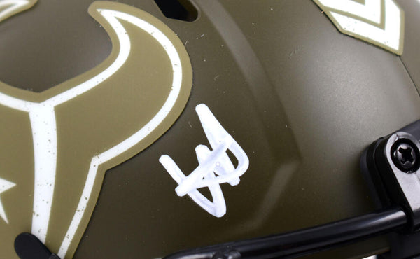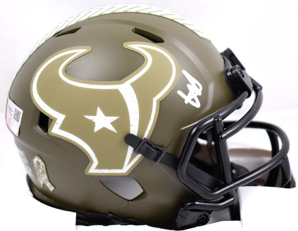 Will Anderson Autographed Houston Texans Salute to Service Speed Mini Helmet- Fanatics *White This is a hand autographed helmet of Will Anderson of The Houston Texans. This is a Riddell Football Salute to Service Speed Mini Helmet. This item has a Fanatics Authentication, which Comes with a Fanatics numbered sticker hologram and a QR code for verification. You can view this item on the Fanatics website and it shows the item was signed. It was signed either at a public autograph appearance or a Private Signing. This is a stock photo of the item. Although you may not receive this exact item, the item you receive is virtually identical and brand new in great shape.