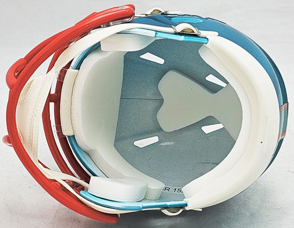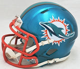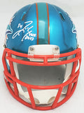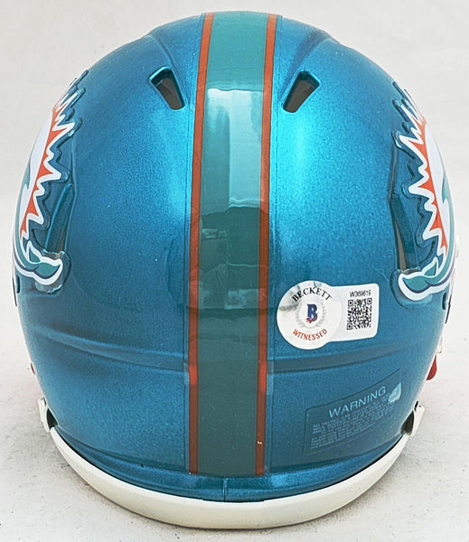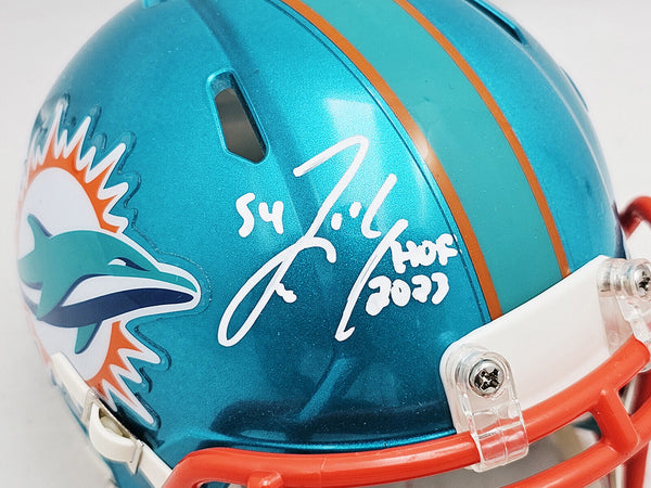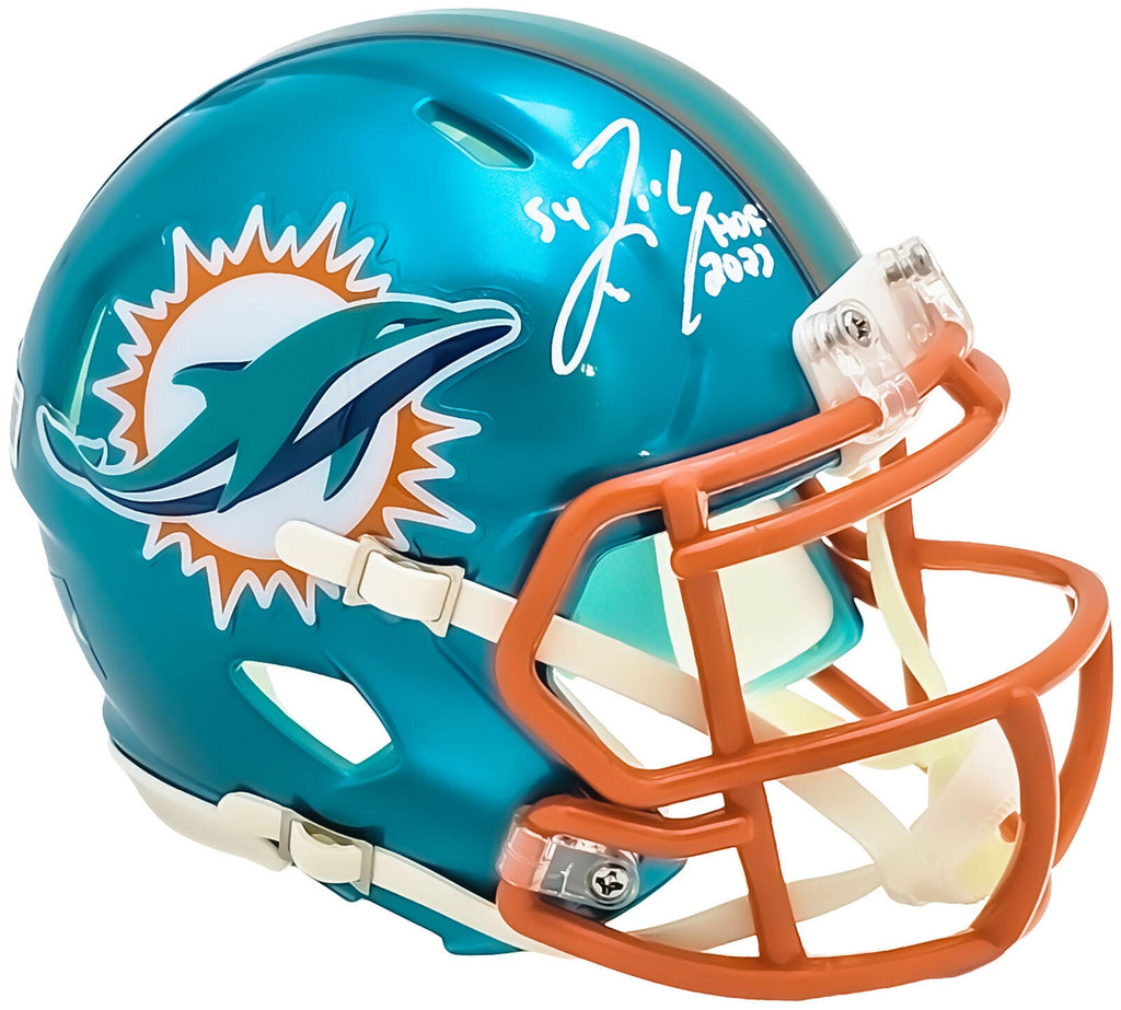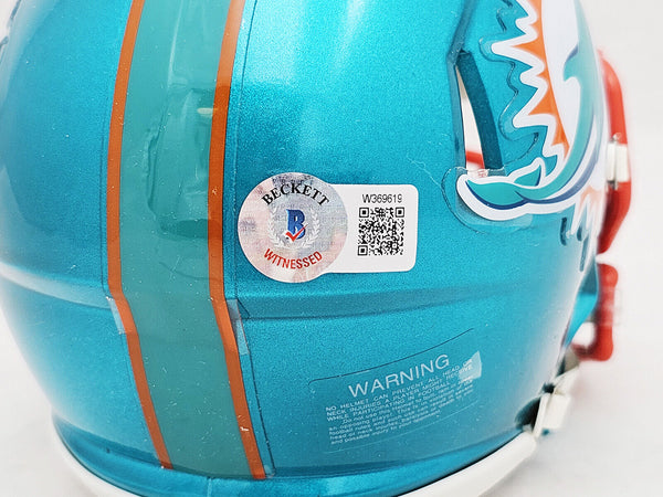 This is a Miami Dolphins Flash Teal Speed Mini Helmet that has been hand signed by Zach Thomas. The Flash helmets are delicate and may have some marks or scratches on them. This item was inscribed "HOF 2023." This item has been witnessed and certified authentic by Beckett Authentication (BAS) and comes with their tamper-proof witness sticker. Beckett Authentication has recently changed their physical certificate card policy where they no longer match their tamper-proof sticker with a physical certificate. A certificate can be printed on Beckett's website for the matching authentication number.
