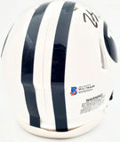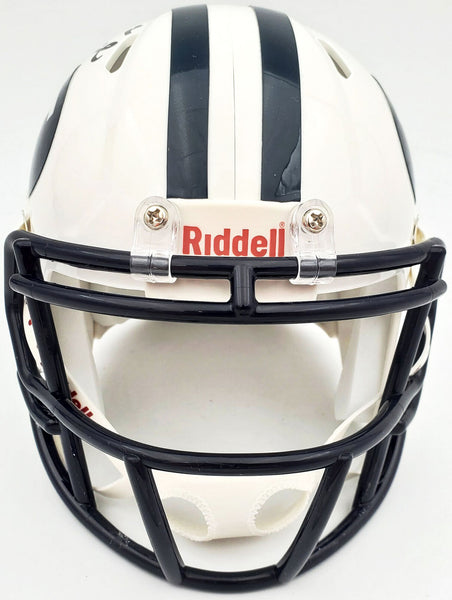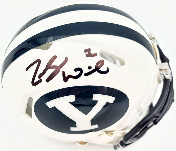 This is a BYU Cougars White Speed Mini Helmet that has been hand signed by Zach Wilson. This item has been certified authentic by Beckett Authentication (BAS) and comes with their tamper-proof sticker and matching certificate of authenticity.