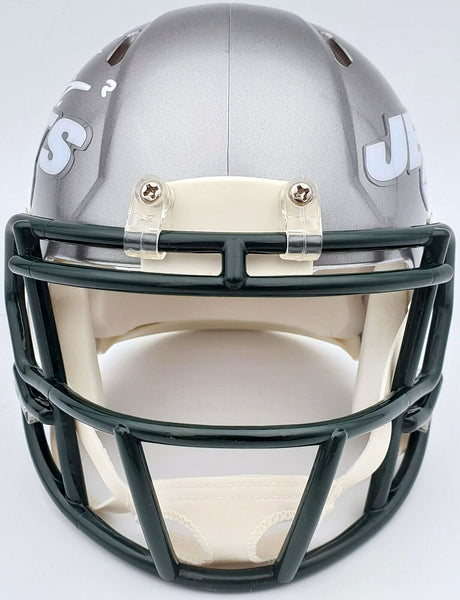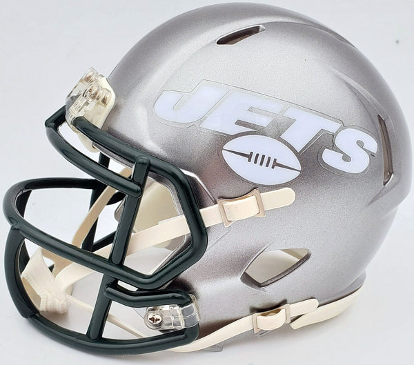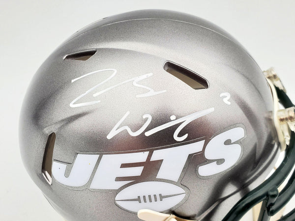 This is a New York Jets Flash Silver Speed Mini Helmet that has been hand signed by Zach Wilson. The Flash helmets are very delicate and often have some marks or scratches on them. This item has been certified authentic by Beckett Authentication (BAS) and comes with their tamper-proof QR Code sticker that can be verified on the Beckett-authentication.com.