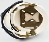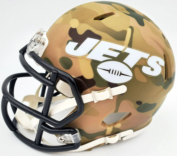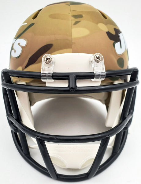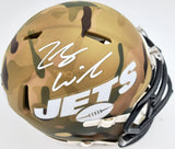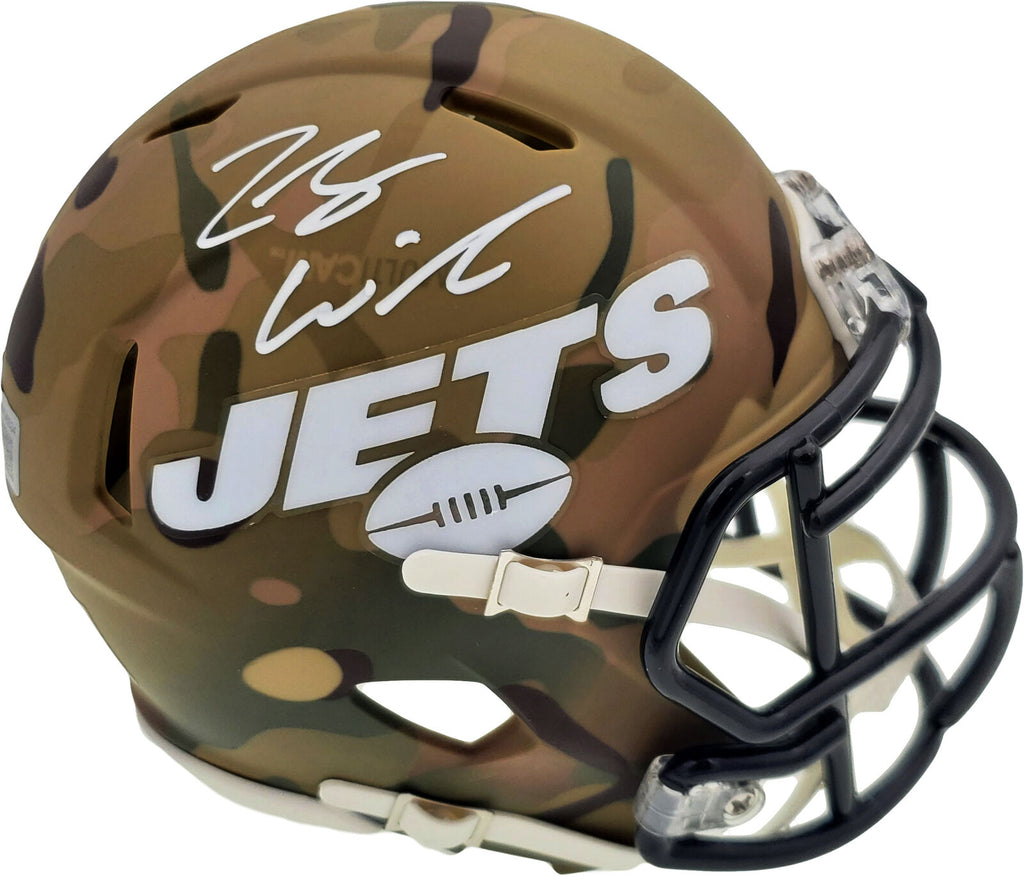 This is a New York Jets Camo Speed Mini Helmet that has been hand signed by Zach Wilson. Because each Camo helmet is hand-dipped using water-transfer technology there may be slight imperfections. This item has been certified authentic by Beckett Authentication (BAS) and comes with their tamper-proof QR Code sticker that can be verified on the Beckett-authentication.com.