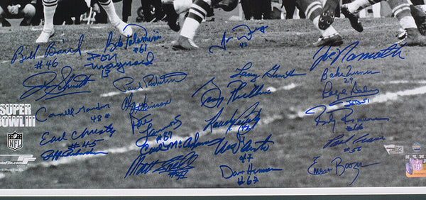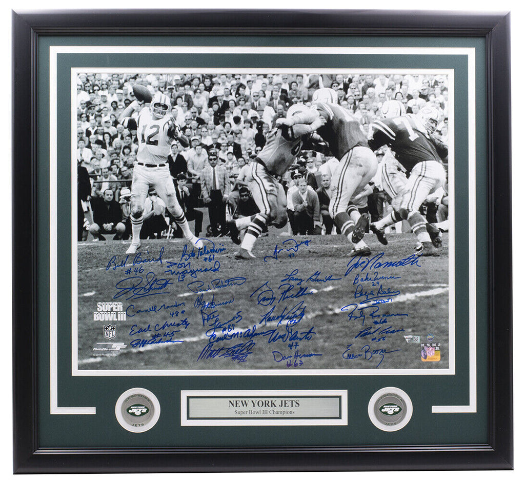 Featured is a 1969 New York Jets multi signed framed 16x20 Super Bowl III football photo. This photo was hand signed by Joe Namath, Don Maynard, Bake Turner, Pete Lammons, Dave Herman, John Schmidt, Bob Talamini, Randy Rasmussen, Gerry Philbin, Paul Rochester, Carl McAdams, Al Atkinson, Ralph Baker, Larry Grantham, Bill Baird, Cornell Gordon, Randy Beverly, John Dockery, Earl Christy, Paul Crane, Jeff Richardson, Mike D'Amato, Emerson Boozer and Matt Snell and has been authenticated by Fanatics and Steiner authentication services. Included with the photo is a Fanatics and Steiner hologram and certificate of authenticity. This photo has been professionally framed and matted and measures approximately 22x27.. SPECIFICATIONS Autographed By: Joe Namath Team: New York Jets Sport: Football Authentication: Fanatics Authentic