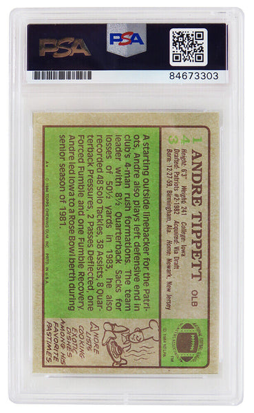 Andre Tippett signed New England Patriots 1984 Topps rookie football card #143 with 'HOF 08' inscription. The card has been authenticated and encapsulated by PSA/DNA and the number can be verified online. The image of the item is a stock photo, as we may have multiples of the item in stock. The Slabbed Card you will receive will be of the card described. (Same grade, Same authentication) You may or may not receive the exact PSA serial number on the slab label shown in image.