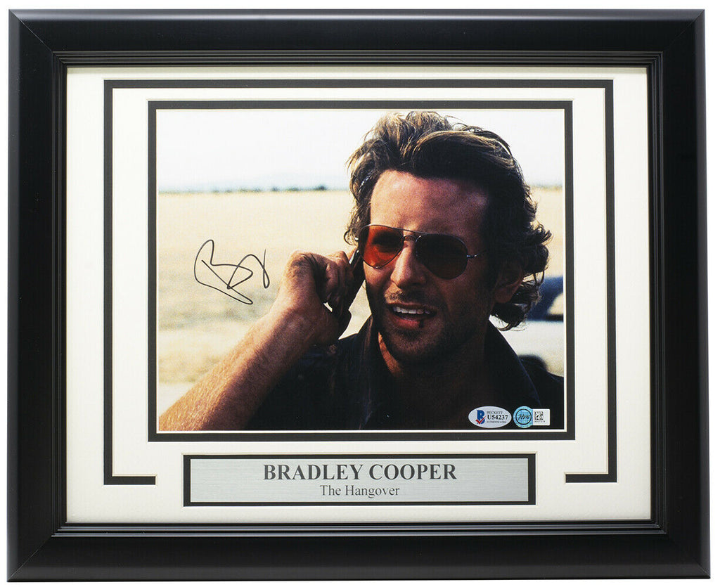 Featured is a Bradley Cooper signed framed 8x10 The Hangover photo. This photo was hand signed by Bradley Cooper and authenticated by Beckett authentication services. Included with the photo is a Beckett hologram and certificate of authentication. Brand new professional framing featuring double matting and engraved nameplate. The frame measures approximately 11x14 in total size, and it is ready for display. This item would make a great addition to any sports memorabilia collection. Product Details BrandSports IntegrityManufacturerSports IntegrityProduct TypeEntertainment/Autographed PhotosMpn36341