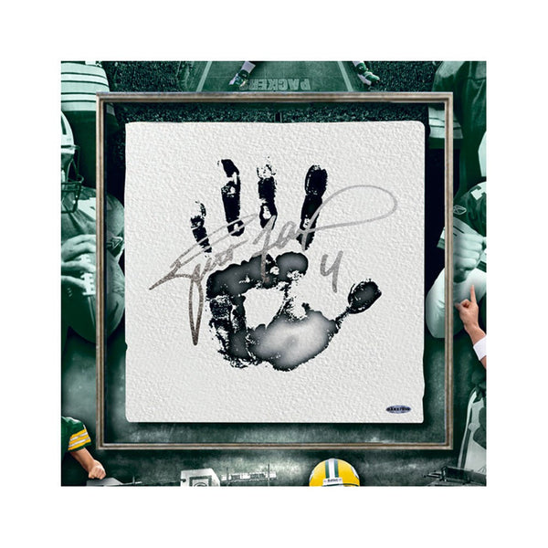 Brett Favre played 16 seasons as a member of the Green Bay Packers. Favre was inducted into the prestigious Pro Football Hall of Fame in 2016. He led the Packers to a Super Bowl championship, and the Green Bay Packers have honored him by retiring his jersey number, #4. Favre was the passing touchdown leader four times throughout his career and was a two-time NFL passing yards leader. In conjunction with Upper Deck Authenticated, Brett Favre is the latest in a short line of great athletes to be honored with a unique "Tegata" memorabilia piece. A "Tegata" is a traditional form of Japanese memorabilia that is reserved only for the most superior athletes. Utilizing handmade Japanese Hamada paper, Favre has inked his right hand in black and included an authentic Inkan stamp which aligns with the traditional craft. The overall keepsake, which measure 36" wide by 36" high, includes a 9.5" by 10.5" inset center upon which Favre's hand has been inked and is surrounded by a double-matted collage style background of Green Bay Packers images. Favre performed the "Tegata" process under supervision of UDA officials and helped in the hand-crafting of 44 uniquely authentic stamps for the debut release. The limited-edition silver autographed hand print is guaranteed authentic by virtue of Upper Deck Authenticated's Five-Step Authentication Process.