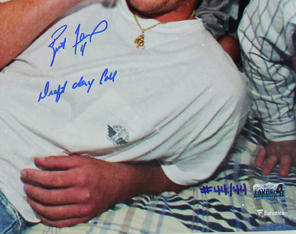 A Green Bay Packers Unframed 16x20 NFL Photo - Talking on Phone hand signed by Brett Favre. The item and signature are in excellent condition. In addition to signing his name, Brett also inscribed "Draft Day Call" on the item. This is a Limited Edition of 44 of 44. Buyer will receive #44 from the edition. A 20 year veteran of the NFL, Brett is a Super Bowl Champion, 11x Pro Bowler, 3x AP NFL Most Valuable Player, 4x NFL passing touchdowns leader, and 2x passing yards leader. His number, 4, has been retired by both the Green Bay Packers and the Southern Miss Golden Eagles. Brett was inducted into the Pro Football Hall of Fame in 2016. AUTHENTICATION: The item is accompanied by a Brett Favre Exclusive Certificate of Authenticity - Brett Favre Exclusive Serial Numbered and Databased Hologram - Picture of Brett from the signing