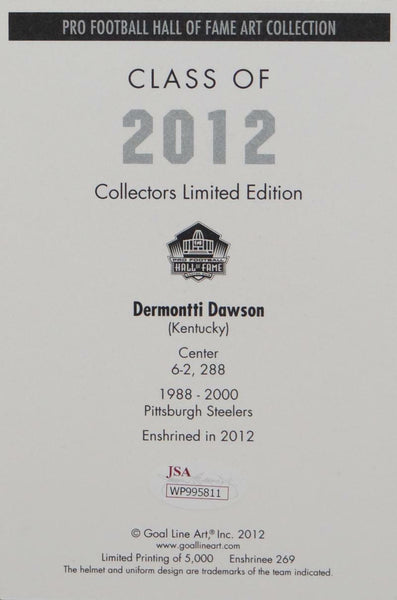 Dermontti Dawson Autographed Steelers Goal Line Art Card W/ HOF- JSA W Auth This is a Hand Autographed Goal Line Art Card of Dermontti Dawson of the Pittsburgh Steelers and inscribed with HOF 12. This item has a James Spence Witness Protection Authentication, which comes with a JSA #'ed Sticker and a matching JSA Certificate of Authenticity. You can view this item on the SpenceLOA website, it shows when and where the item was signed. It was signed either at a public autograph appearance or a Private Signing. This is a stock photo of the item. Although you may not receive this exact item, the item you receive is virtually identical and brand new in great shape.