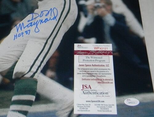 Don Maynard, former Hall of Fame wide receiver for the New York Jets, has hand signed this 16x20 photo at a private signing. This item comes with a certificate of authenticity (COA) from JSA - James Spence Authentication and was signed in the presence of one of their representatives. You will receive a serial-numbered COA along with a matching serial-numbered sticker on the photo. The authenticity can be verified online by entering the serial number.Item pictured may not be the exact item you will receive. It will be similar quality, and we guarantee your satisfaction.