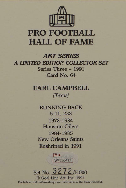 This is a hand autographed Goal Line of Earl Campbellof The Houston Oilers. This item has a James Spence Witness Protection Authentication, which comes with a JSA numbered sticker and a matching JSA COA. You can view this item on the SpenceLOA website, it shows when and where the item was signed. It was signed either at a public autograph appearance or a Private Signing. This is a stock photo of the item. Although you may not receive this exact item, the item you receive is virtually identical and brand new in great shape. This is a hand autographed Goal Line of Earl Campbellof The Houston Oilers. This item has a James Spence Witness Protection Authentication, which comes with a JSA numbered sticker and a matching JSA COA. You can view this item on the SpenceLOA website, it shows when and where the item was signed. It was signed either at a public autograph appearance or a Private Signing. This is a stock photo of the item. Although you may not receive this exact item, the item you receive is virtually identical and brand new in great shape.