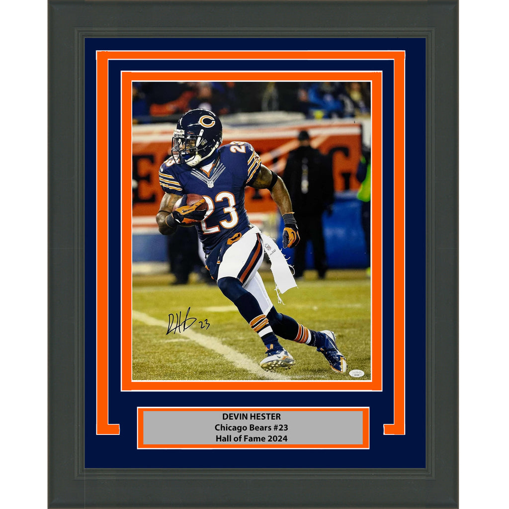 Framed Autographed/Signed Devin Hester Chicago Bears 16x20 Photo JSA COA #3 The item is professionally framed & matted and is ready to be hung in your man cave! Nameplate and matting requests can be made.