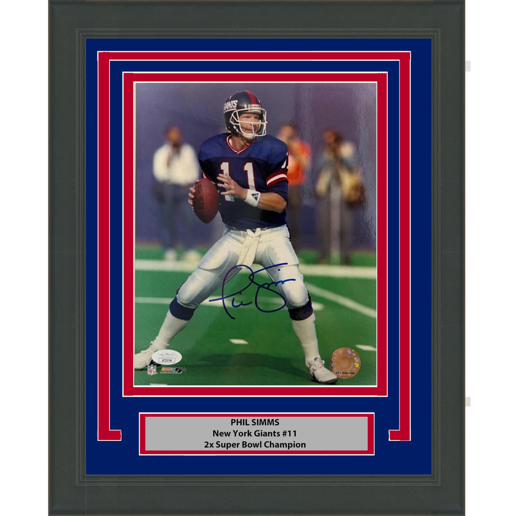 Framed Autographed/Signed Phil Simms New York Giants 8x10 Football Photo JSA COA The item is professionally framed & matted and is ready to be hung in your man cave! Nameplate and matting requests can be made.