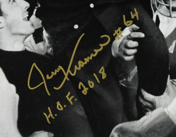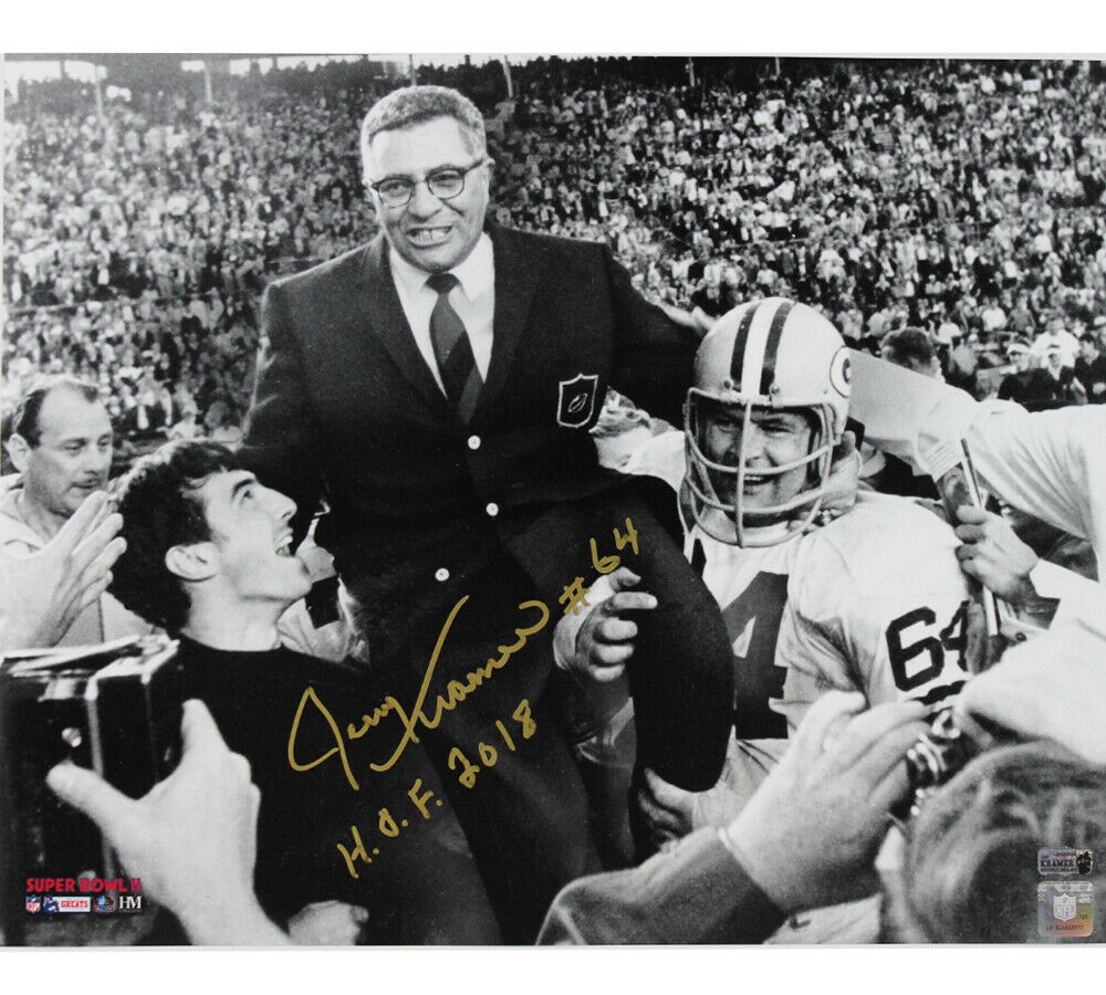 A Green Bay Packers Unframed 16x20 NFL Photo - Lombardi & Players hand signed by Jerry Kramer. The item and signature are in excellent condition. In addition to signing his name, Jerry inscribed "HOF 2018" on the item. Jerry is a 2x Super Bowl Champion, 5x NFL Champion, 3x Pro Bowler, and is in the Green Bay Packers Hall of Fame. AUTHENTICATION: The item is accompanied with a Jerry Kramer Exclusive Certificate of Authenticity - Jerry Kramer Exclusive Serial Numbered and Databased Hologram - Picture of Jerry from the Signing