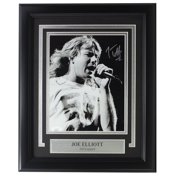 Featured is a Joe Elliott signed framed 8x10 Def Leppard photo. This photo was hand signed by Joe Elliott and authenticated by JSA authentication services. Included with the photo is a JSA hologram and certificate of authentication. Brand new professional framing featuring double matting and engraved nameplate. The frame measures approximately 11x14 in total size, and it is ready for display. This item would make a great addition to any sports memorabilia collection.. SPECIFICATIONS Autographed By: Joe Elliott Team: Sport: Authentication: James Spence Authentication (JSA)