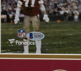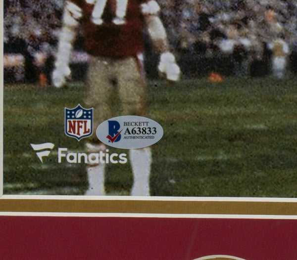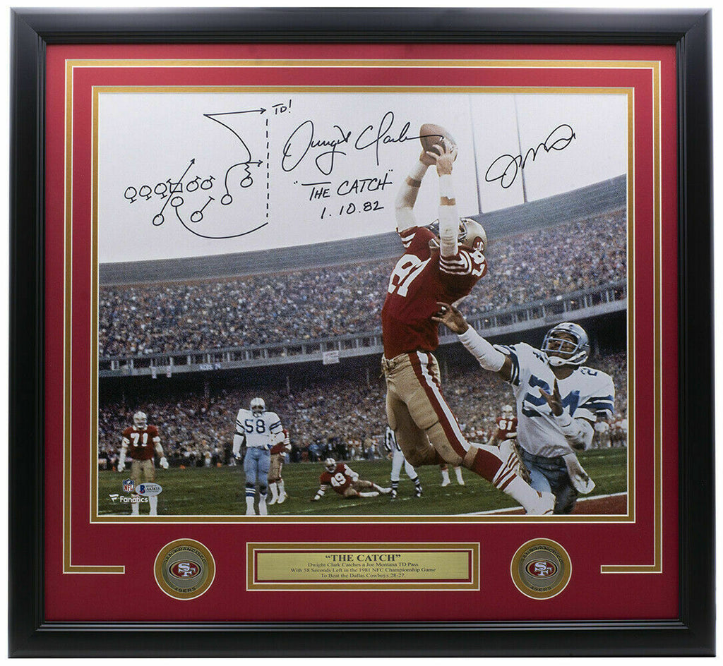 Featured is a Joe Montana and Dwight Clark signed framed 16x20 San Francisco 49ers "The Catch" photo, in which they added the drawing of the play and the "The Catch Play 1.10.82" inscription. This photo was hand signed by Joe Montana and Dwight Clark and authenticated by Beckett authentication services, in which the autographs were graded a 10. Included with the photo is a Beckett hologram and letter of authenticity. This photo has been professionally framed and matted and measures approximately 22x27, and has two San Francisco 49ers medallions.. SPECIFICATIONS Autographed By: Joe Montana and Dwight Clark Team: Carolina Panthers Sport: Football-NFL Authentication: Beckett Authentication Services