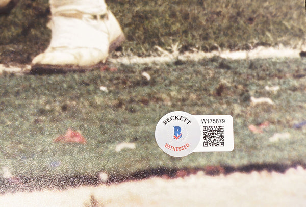 This is a 16x20 Photo that has been hand signed by Joe Namath. This item has been witnessed and certified authentic by Beckett Authentication (BAS) and comes with their tamper-proof witness sticker. Beckett Authentication has recently changed their physical certificate card policy where they no longer match their tamper-proof sticker with a physical certificate. A certificate can be printed on Beckett's website for the matching authentication number.
